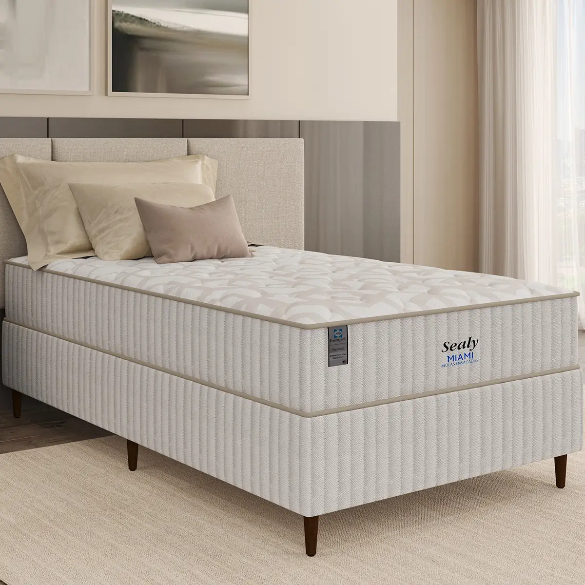 O Colchão Miami Solteiro 26x188x88cm Com Molas Ensacadas Sealy é ideal para um sono reparador, combinando suporte individualizado que não transfere movimento com tecnologias avançadas. Ele possui o reforço Polyframe nas bordas para aumentar a área útil e estabilidade, além de uma Manta Acrílica para proteger as molas e a espuma, garantindo durabilidade. Fabricado com a tecnologia americana, o colchão inclui um EuroPillow para maciez extra, bordado localizado para sofisticação e malha de alta qualidade, e conta com proteção antiacaro, antibacteria e antifungo essencial para climas úmidos. O revestimento inferior antiderrapante e o tecido Suede nas laterais completam o design elegante e funcional deste produto, prometendo conforto e satisfação.