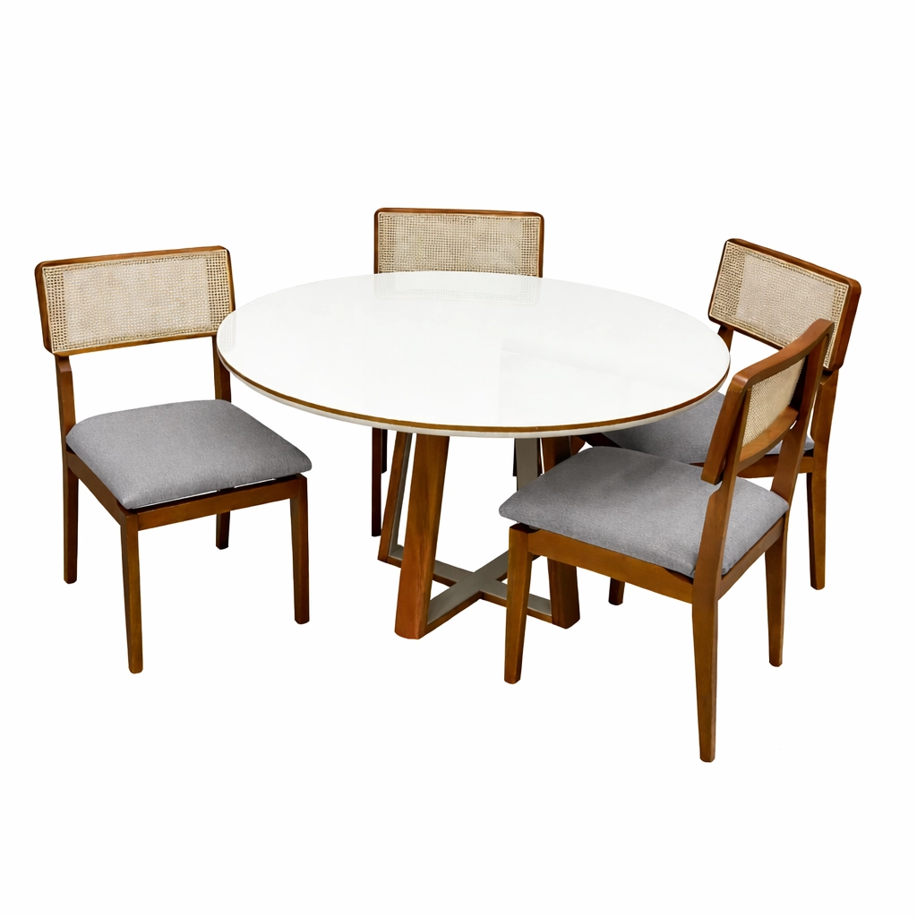 Mesa de Jantar Atlanta 120cm Redonda com Vidro e 4 Cadeiras Canada em Linho Madeira Minas Plac