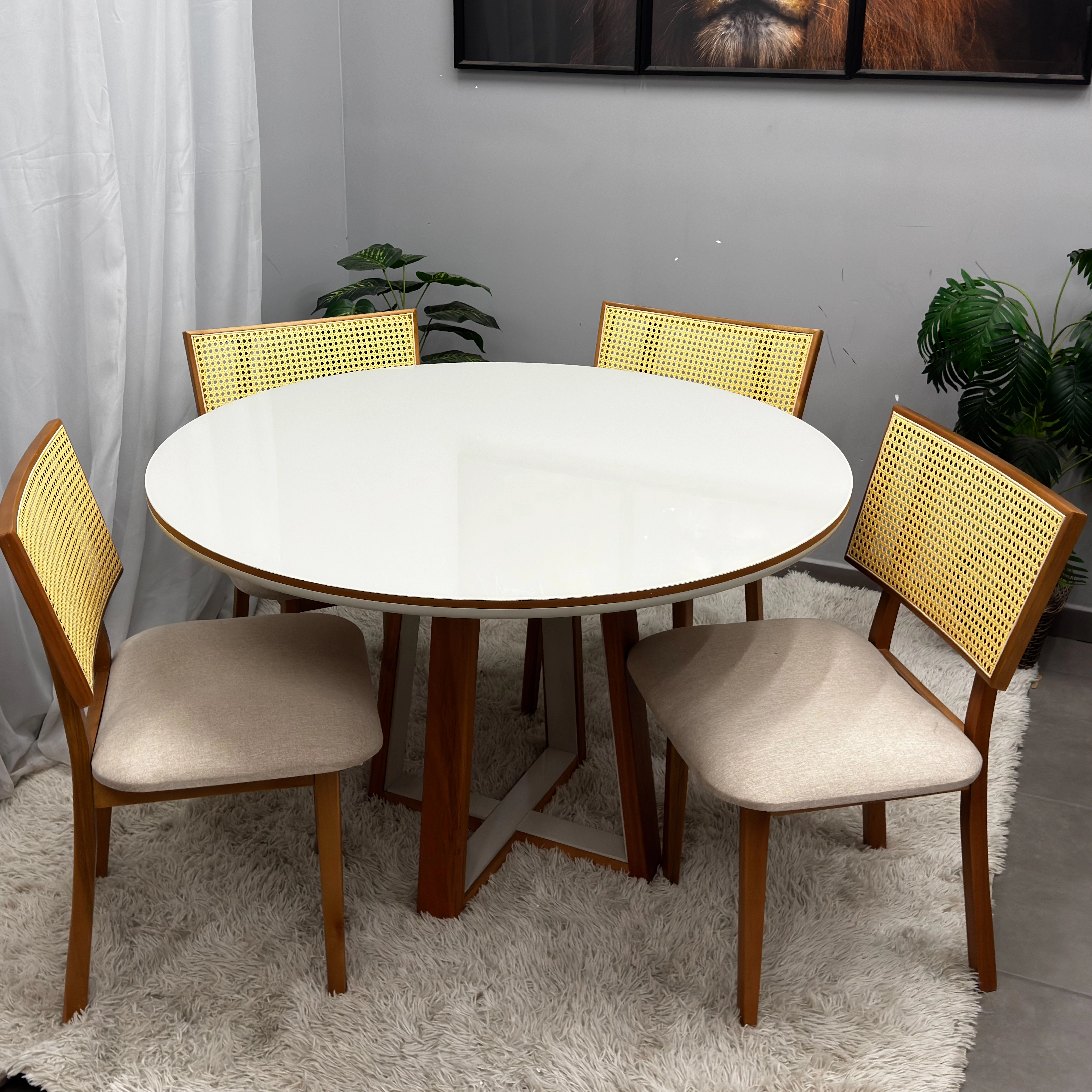 A Mesa de Jantar Atlanta 120cm Redonda com Vidro e 4 Cadeiras Diamante em Linho Madeira Minas Plac combina sofisticação e funcionalidade, apresentando um tampo redondo de com vidro que amplia e ilumina o ambiente. O conjunto acompanha 4 cadeiras Diamante, que oferecem alto conforto com estofamento em tecido linho de toque agradável e design ergonômico. Fabricado pela Minas Plac, o conjunto utiliza madeira de alta qualidade, garantindo durabilidade e estabilidade para o uso diário. Seu estilo contemporâneo adapta-se perfeitamente a salas de jantar ou cozinhas compactas, unindo a beleza da madeira com a modernidade do vidro. É a escolha ideal para quem busca um móvel elegante, resistente e capaz de proporcionar momentos memoráveis em família.