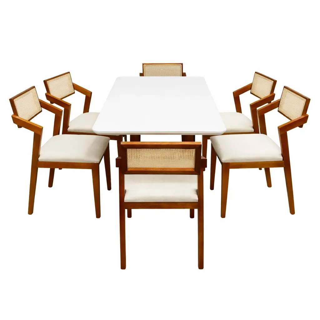 Mesa de Jantar Bali 160x90cm com Vidro e 6 Cadeiras Berlim HR em Linho Madeira Minas Plac