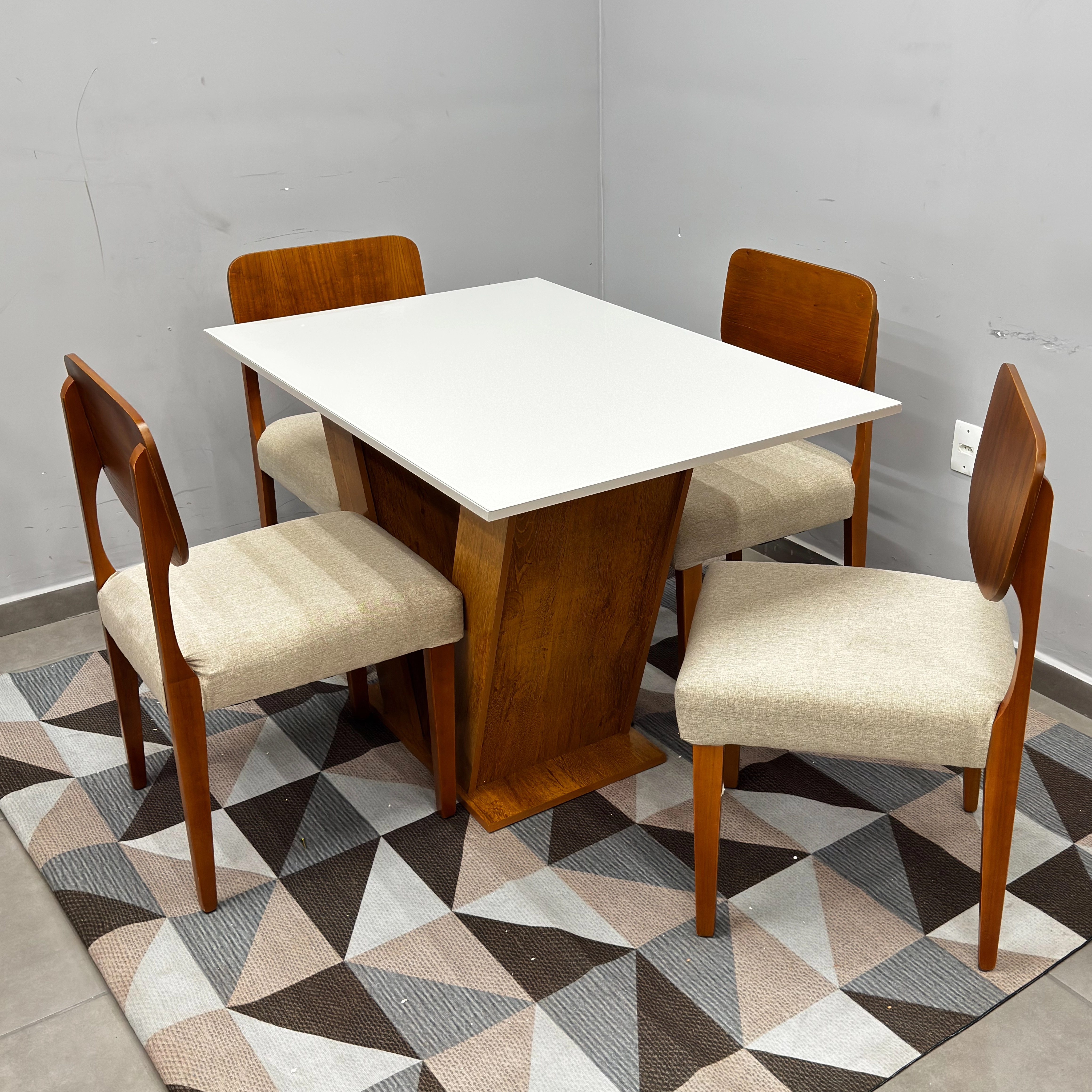 O conjunto acompanha 4 cadeiras, projetadas para proporcionar uma experiência de máximo conforto. Combinando robustez e sofisticação, este conjunto apresenta um acabamento refinado que harmoniza com diversos estilos de decoração, do clássico ao contemporâneo. É a peça central que faltava para renovar seu ambiente com qualidade superior e um visual impecável que impressiona as visitas.