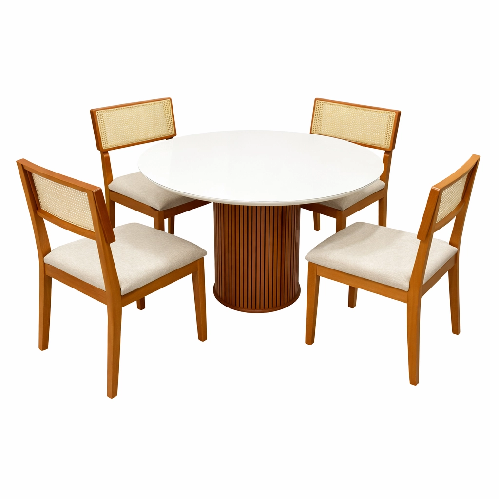 Mesa de Jantar Dara 110cm Redonda com Vidro e 4 Cadeiras Canada em Linho |